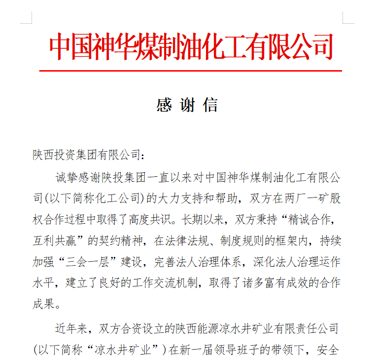 “誠摯感謝陜投集團一直以來對中國神華煤制油化工有限公司的大力支持和幫助……作為股東方,我們對涼水井礦業(yè)領導班子和廣大干部職工所做的突出貢獻予以充分肯定和高度贊賞,并向大家表示衷心的感謝!”近日,中國神華煤制油化工有限公司向集團公司發(fā)來感謝信,對與集團在兩廠一礦股方面的良好合作,對陜西能源權屬涼水井礦業(yè)公司生產(chǎn)經(jīng)營的突出成果表達誠摯感謝。