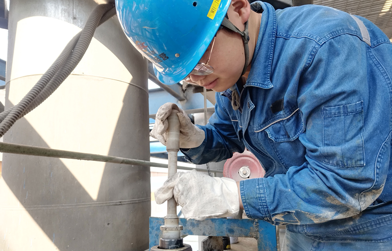 做好風險辨識、隱患排查、“兩交底”等準備工作,陳濤拿起扳手,開始拆卸濾網端蓋。由于管道系統密集,他只能蜷身在管道的空隙間,一手握扳手,一手固定端蓋,小心松動螺絲。室內空間狹小悶熱,不一會兒,他的臉上便浸滿細密的汗珠。緊完最后一根螺栓,濾網更換完成,陳濤才拖著僵硬的身子,從管道的間隙鉆出來,邊活動麻木的雙腿,邊擦拭著臉上的汗水。“這點活,也就是一碟小菜,只要機組運行平穩,大家安心過節,這點辛苦,值了!”陳濤憨笑著說。